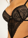 Our Cassa bodysuit is everything you need and more. The Cassa bodysuit offers a beautiful display of conceal-and-reveal elements that are guaranteed to keep things interesting. It features cut-out sides and underwire push-up cups to show off your curves in this bold piece made to impress.