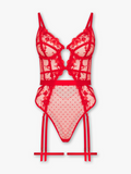 Be seduced by the allure of our Natalia Bodysuit, designed to captivate with its sheer mesh adorned with playful polka dots and intricate floral embroidery. With decorative cutouts, Natalia is the epitome of sensual elegance. Complete the look with lace stockings and radiate confidence.