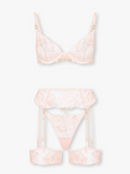 Slip into our Rosalia lingerie set and let temptation take over. Soft blush mesh is combined with delicate floral lace, while gold-tone chains and hardware add a daring edge. Designed to tease from every angle, this set turns sweet into utterly seductive.