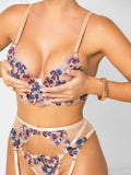 Add some serious sexiness and charm to your drawer with the Ruby lingerie set. This sheer, lacy three-piece set features delicate floral embroidery with tones of blue and red. It's bound to bring the heat to any evening.