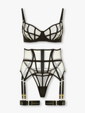Our fiery three-piece Scarlet set is a corset-inspired showstopper with daring sheer mesh, bold satin panels, and gold-tone hardware that catches the light with every move. The sculpted bodice and barely-there thong are designed to shape, tease, and ignite from every angle.